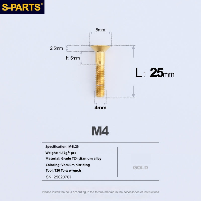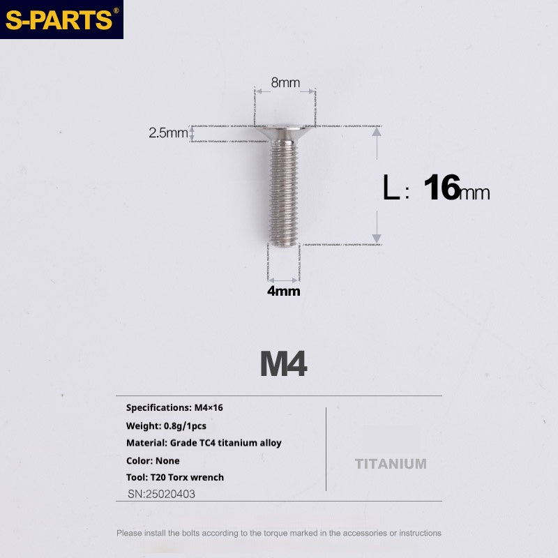 The SPARTS Countersunk Head Series M4 Titanium Screws are designed for enthusiasts who seek to improve their vehicle's performance and appearance. Whether you are upgrading your motorcycle or car, these screws offer a perfect combination of functionality and style. The countersunk head design ensures a flush fit, making them ideal for applications where a smooth, sleek surface is desired.